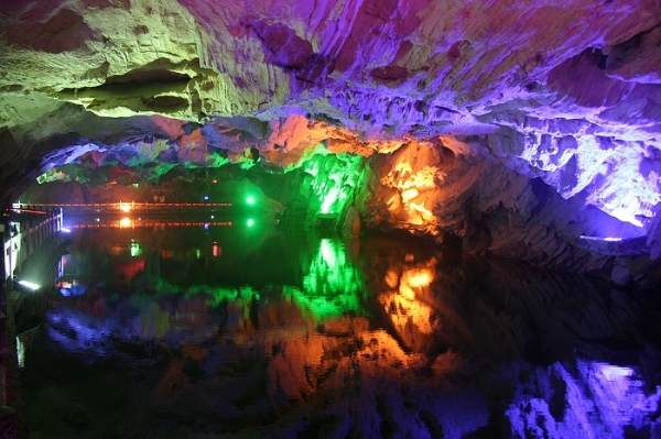 坐在船中,看河水清澈晶瑩,溪中怪石嶙峋,氣象萬(wàn)千,或如蛟、或如鱉、或如龜、或如鳥(niǎo)、或如象,在五彩的燈光下,色彩斑斕,形態(tài)華肖;更有龍舞蛟騰、紫電飛空、金霞生輝的特殊水中世界,撩人遐思神往。