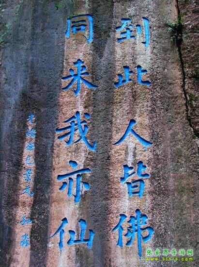 不二門內(nèi)由石灰?guī)r風化形成的一尊巨大石佛,聳立于萬綠叢中,高六丈,青冠白面,頭頂白云,腳踏碧水,人們以其形神稱為“觀音巖”?!队理樋h志》稱“觀音巖素有‘湘景名峰第一巖’之稱”。觀音巖下,聳立著一組瑰麗多姿、古色古香的殿閣建筑群,這就是“嵩山堂”,包括三觀殿、玉皇閣和禪房客舍,工藝精巧,玲瓏別致。特別是正殿后的地藏庵,與老司城明代建筑祖師殿結(jié)構(gòu)相似,背倚石壁,右通八陣圖,左達熱水坑,周圍怪石森列,古木參天。觀音巖北部山上是天造地設(shè)的“八陣圖”,有的如排戟,有的似春筍;有的像古佛,有的若走獸。八陣圖之奇,不僅在于它林立的怪石,最主要的是在于由龜裂紋石板鋪成的時上時下時隱時現(xiàn)的彎彎小徑——或穿過地下幽深的石洞,或延展于密林雜草叢中,或環(huán)繞于奇峰怪石之間,使八陣圖的東、南、西、北四門相通,復(fù)雜繁多的石徑互相連接形成網(wǎng)絡(luò),人們有時難以找到出路。也許,這就是八陣圖命名的緣由。不二門內(nèi)兩側(cè)石壁開闊如屏,歷代文人墨客或贊山水之幽絕,或抒心胸之豪情,雕鑿了種種摩崖石刻。據(jù)《永順縣志》記載,不二門石刻有神秀獨鐘、吾道南來、白云門開、砥柱中流、眼前南海、百寶勝光、別開生面、別有天地等100多處。歷經(jīng)風雨滄桑之后,現(xiàn)僅存鬼斧神工、勝境無雙、滌盡塵氛、瞻奇仰異、海上飛來等數(shù)十處。清代名士白介庵所作《松徑留云》、《古洞仙蹤》、《層閣聳翠》、《玉嶂屏環(huán)》、《澄潭月影》等觀音巖八景詩尚凸現(xiàn)在石壁之上。其中《石門天鑿》一詩完整無缺:“法門高聳五云偎,鬼斧神工妙化裁。鞭石無痕還著相,振山有鐸不須錘。地沾花雨千歧坦,道接薪傳一線開。莫道終南稱捷徑,巨靈神辟小蓬萊。”清代庚辰年間的探花景元,曾在石壁上題刻“到此人皆佛,同來我亦仙”。他還以一筆揮成的“山青海岸”疊字如圖似的符合成一個“岸”字鑿刻在摩崖之上,堪稱罕世之作。石壁上近年來還鐫刻了偉人毛澤東的詩詞和儒將蕭克、畫家黃永玉等巨擘的題字,游人置身其間,飽享山水美景、名勝古跡與文化藝術(shù)的熏陶。