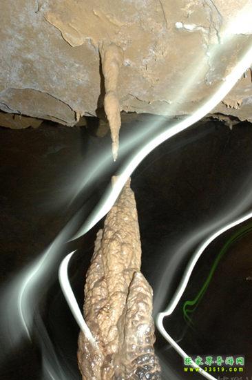 在這兒向您介紹一點(diǎn)溶洞學(xué)的知識(shí)。在溶洞中,自洞頂往下生長的叫石鐘乳,自洞底往上生長的叫石筍,兩者相向生長連在一起就叫石柱,三者統(tǒng)稱為鐘乳石。這兒有一根石鐘乳與一根石筍是相對生長的,差一點(diǎn)點(diǎn)就要連起來了,但他們卻永遠(yuǎn)不能合在一起,因?yàn)樯厦娴氖娙橐呀?jīng)沒有滴水,已經(jīng)失去了生命力。這好像一對苦苦守望的情人,近在咫尺,卻永遠(yuǎn)不能相逢。于是人們便給他們?nèi)×艘粋€(gè)非常動(dòng)人的名字——恨難逢。“盈盈一水間,脈脈不得語。”“天涯海角有窮時(shí),只有相思無盡處。”在無數(shù)個(gè)春去秋來的日子里,他們該有多少離愁別緒?。?mdash;—真不知道是石頭多情,還是人多情?——而有的人說得很樂觀,“兩情若是長久時(shí),又豈在朝朝暮暮”,所謂“距離產(chǎn)生美”嘛。
