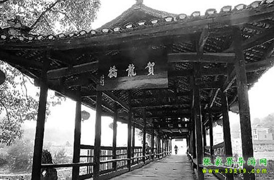 賀龍橋原稱“永安橋”。飛架于賀龍故居右側(cè)玉泉河上,是一座石墩、木粱、騎廊的風(fēng)花橋。東西長40米、寬7米、高8米。龍爪翹檐,中聳堡亭,8尊石獅,分置橋頭及石墩之上,造型渾厚古樸,富有民族特色。此橋原是溝通桑植內(nèi)外半縣的必經(jīng)之道,是上川鄂下津澧的要津,也是當(dāng)年鹽局奪槍、桑植起義的發(fā)端處。系賀龍曾祖父賀廷宰首倡捐資修建,幾番修而復(fù)圮。至1916年,終由賀龍父親賀仕道襄修告竣。1929年冬,桑植“剿共”司令陳策勛,謂以破“賀氏風(fēng)水”,令毀此橋。解放后,桑植縣人民政府于1952年冬按原樣復(fù)修,命名“賀龍橋”。“文化大革命”動亂中,林彪、“四人幫”誣陷賀龍,指使“紅衛(wèi)兵”毀橋,群眾奮起護(hù)衛(wèi),才幸免劫難。1983年5月,賀帥女兒賀曉明應(yīng)縣政府請求,得全國書法家協(xié)會秘書長謝德萍書匾“賀龍橋”,高懸橋之東西首,永志紀(jì)念。1978年,賀龍故居及其生平業(yè)績陳列室、賀龍橋,列為省級重點文物保護(hù)單位。凡到賀龍故居、賀龍紀(jì)念館的游客這是必經(jīng)之地。