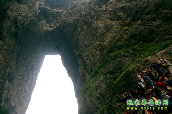天門洞是天門山最具有代表意義的景點(diǎn),它位于天門山山體的中上部,海拔1300米,門高131.5米,寬57米,深60米,是世界上最高海拔的天然穿山溶洞。