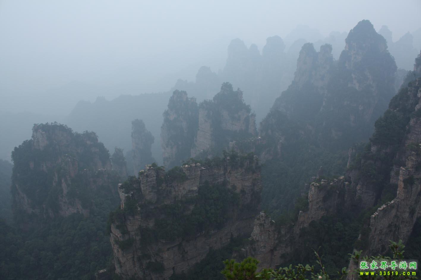 自乾坤柱觀景臺(tái)向西轉(zhuǎn)過(guò)一彎,有頂端平整的巖嘴突出崖沿6米左右,臨絕壁半面有四個(gè)邊長(zhǎng)相等的天然鈍角,銀灰色銅管欄桿圍護(hù),左右石凳排列,別致而高雅。憑欄極目,遠(yuǎn)處六巨峰兩兩相對(duì),排列成陣,頂天立地,氣勢(shì)磅礴。另有兩峰如屏,橫斷天際。兩峰屏、六峰柱之間的谷中,四座瘦長(zhǎng)石峰次第而下,自遠(yuǎn)而近,由高到低,連成一線,長(zhǎng)達(dá)兩千多米,有如梯級(jí)。在這四座瘦長(zhǎng)石峰中上部,另有兩巨峰偎依,渾圓如柱。據(jù)說(shuō)是如來(lái)佛伸出的兩根指頭,其用意如何,至今無(wú)人能解。其下有巨石構(gòu)成的天然神殿,如雨后晴明,殿內(nèi)佛像依稀可見(jiàn)。右側(cè)一峰頂部似靴,據(jù)說(shuō)是登“步步高”上天梯的神人走得匆忙,遺忘一只在此。攀欄俯視,300多米深的絕壁根前,有兩排峰體如古城門(mén),八字排列,墻壁斑駁陸離,古野凄涼。古城門(mén)與步步高天梯相聯(lián)成趣:昔人拾級(jí)登天去,此地空余古城門(mén)。“昔人”是誰(shuí)?“古城門(mén)”建于哪朝哪代?留與后秀破解。這里雖有諸多疑團(tuán)使人困惑,但是充滿幽野之美,引人入勝。