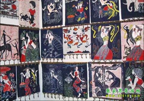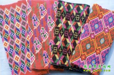 刺繡。是土家姑娘在直紋平布上,按照布紋的經(jīng)緯和預(yù)先繪畫(huà)的花樣與底色不同的絲線繡成圖案。舊時(shí)姑娘們穿的繡花衣服,繡有服飾花邊、胸花、帽花,此外繡花枕頭、繡花荷包等也是精巧的手工工藝品。土家刺繡在配色上有自己的講究與習(xí)慣,一般選用青、藍(lán)、大紅等深色布料作底布,用淺色繡線制作圖案,或者相反,兩種用法的結(jié)果使繡品顯得質(zhì)樸逼真,色澤鮮艷,對(duì)比強(qiáng)烈。傳統(tǒng)圖案有“花開(kāi)富貴”、“龍鳳呈祥”、“鴛鴦戲水”、“喜鵲鬧梅”、“松鶴同壽”等,分室內(nèi)、衣著、工具、行李裝飾等多種種類(lèi)。在景區(qū),土家婦女邊繡邊賣(mài)的精美鞋墊,深受海內(nèi)外游客喜愛(ài)。
