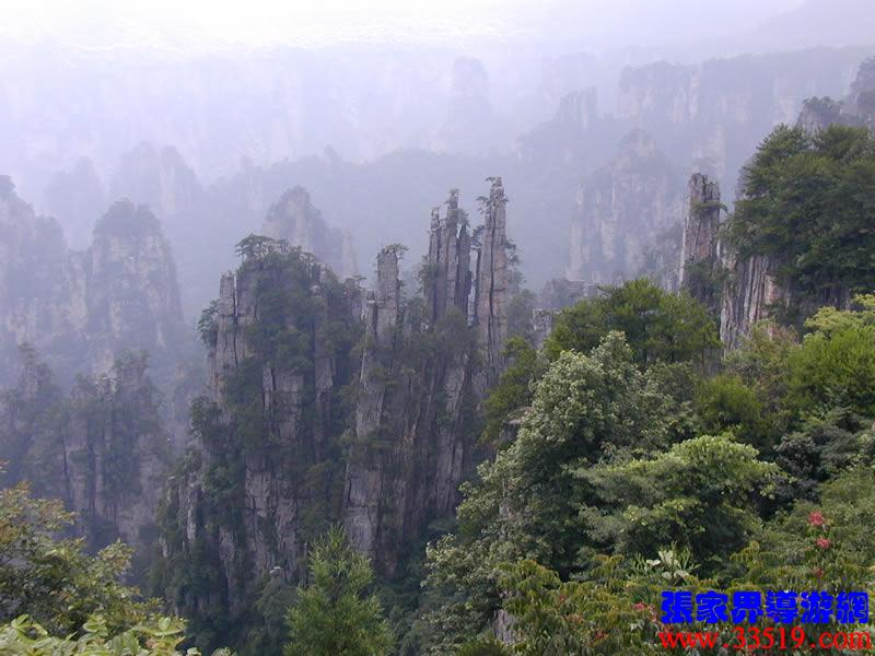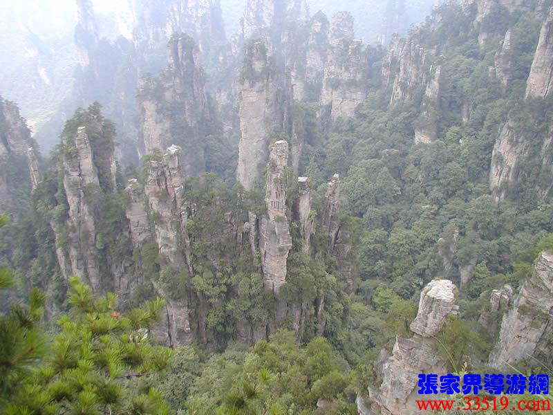 (大觀臺(tái))這就是大觀臺(tái)。極目遠(yuǎn)眺,千百座奇峰盡收眼底。一位詩人說,武陵源的砂巖峰林是一步一觀景,千步千造型,一山有四季,十步不同天。專家測(cè)算出武陵源石峰有3103座。一如一位高超的雕塑大師,模擬宇宙萬物,無不形狀逼真,維妙維肖,栩栩如生,呼之欲動(dòng)。有的如海螺出水,有的如金龜銜日,有的如蓮花盛開,有的如天橋橫空,有的如長(zhǎng)槍刺天,有的如寶塔聳立,有的如老人采藥,有的如玉女梳妝,有的如將軍出征,有的如戰(zhàn)馬長(zhǎng)嘯,有的如情人幽會(huì),有的如夫妻相擁,有的如仙女散花,有的如村姑守望有的孤峰獨(dú)秀,有的直插云霄,有的婷婷玉立,有的威武勇猛,有的小巧玲瓏,有的大氣磅礴。進(jìn)入武陵源,但見一片峰的森林,峰的世界,峰的海洋。挺拔、奇秀、集中、原始、粗獷、古野。這就是武陵源。一位藝術(shù)大師說:武陵源的山峰,改寫了山的概念。大攝影家陳勃說:“三山五岳堪比美,華夏風(fēng)光每一流。”王繼杰先生說:“武陵源上三日游,勝讀千篇李杜詩。”許世杰先生說:“秀幽險(xiǎn)峻稱奇絕,五岳黃山拜下風(fēng)。”李成瑞先生為此大抱不平:“神州勝景誰為最?須請(qǐng)霞公重評(píng)勘。”可惜徐霞客無緣到大觀臺(tái)來,也不可能為武陵源作甚評(píng)價(jià)了。