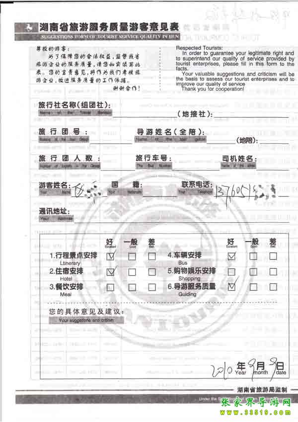 2010年9月9日區(qū)先生旅游質(zhì)量反饋
