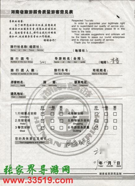 2009年10月1日王先生一行質(zhì)量接待反饋單: