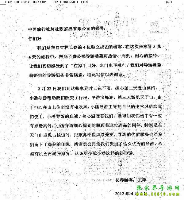 12年4月6日長春貴賓王萍女士給我社導(dǎo)游小潘寄來的表揚信