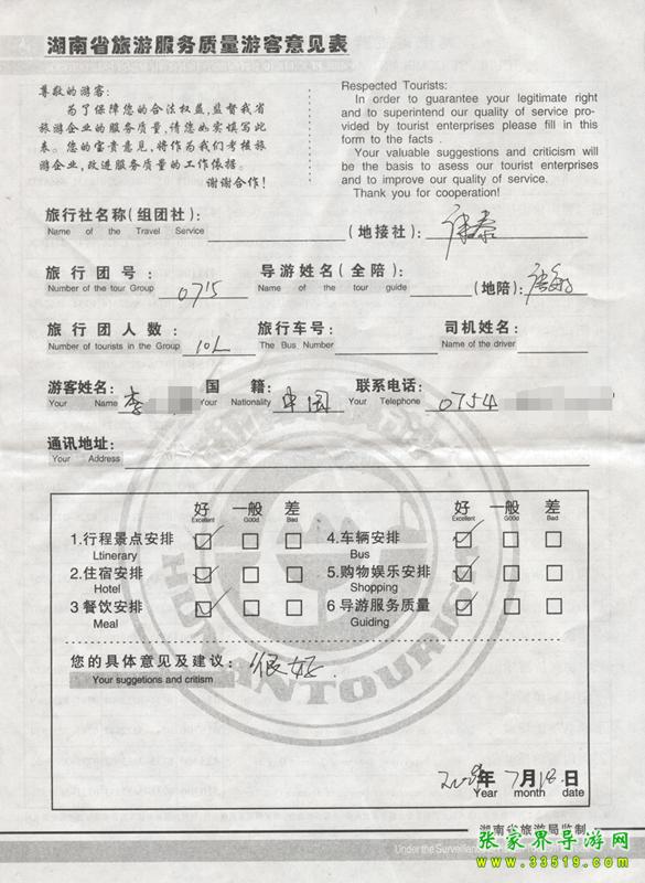 2009年7月15日李女士一行10人質(zhì)量接待反饋單:
