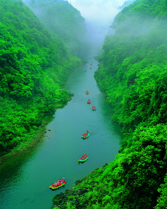 7點(diǎn)準(zhǔn)時(shí)等在萊頓大酒店門口,猛洞河漂流180元/人,漂流的車一般會(huì)來(lái)接參加漂流的客人的,上了車已經(jīng)有好幾位游客,然后車子又去接了幾位,7:30人接齊,離開(kāi)張家界去猛洞河,車程約1個(gè)半個(gè)小時(shí),漂流約2個(gè)半小時(shí)。在萊頓大酒店的那個(gè)晚上張家界半夜打雷下雨,我們想今天水很大,漂流會(huì)很刺激。到了那邊才知道上游建了水壩調(diào)節(jié)水量搞平均主義,所以漂流的驚險(xiǎn)度一般般了,后來(lái)去鳳凰公路上比較顛簸,我戲稱可以將車當(dāng)船補(bǔ)足漂流的感覺(jué),呵呵。不過(guò)瀑布因此壯觀不少,漂流沿途至少見(jiàn)到有七八條瀑布,非常漂亮。